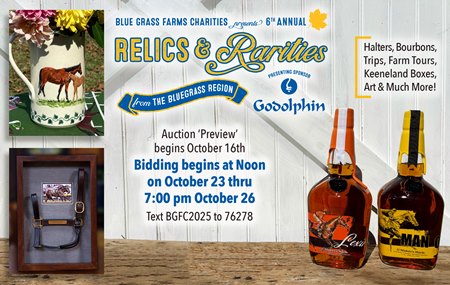 Blue Grass Farms Charities (BGFC) 6th Annual Relics and Rarities from the Bluegrass Region online auction will begin at 12 o'clock, noon on October 23rd and run until 7:00 p.m. October 26th. All items will be available for preview starting October 16th showcasing halters worn by well-known Thoroughbreds, top-shelf Kentucky Bourbons, and unique horse-themed items.